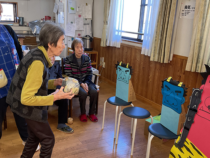 元気よく投げてみえました。「鬼は~外。福は~内」と大きな声をだし、楽しまれました。